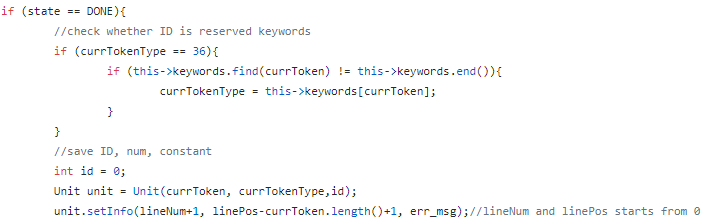 在DONE状态下,要单独对用户声明的标识符或者使用的保留字进行处理,首先要检查是否属于保留字,如果不是,再做其他的处理。