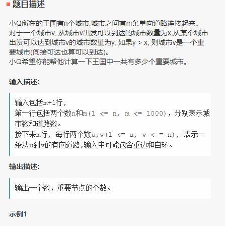 思路就是每次输入一条新的边时,同时获取以起点为终点的城市集合v1,和以终点为起点的城市集合v2,然后任意v1到任意v2设置为true即可,最后统计一下入度出度,满足条件计数器+1,返回结果即可